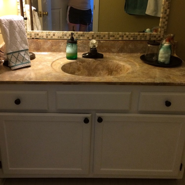 This technique works super well on faux cultured marble surfaces too. After I had such luck in my kitchen with it, I decided to do my upstairs bath as well, and this is how it turned out (sorry for the poor lighting):