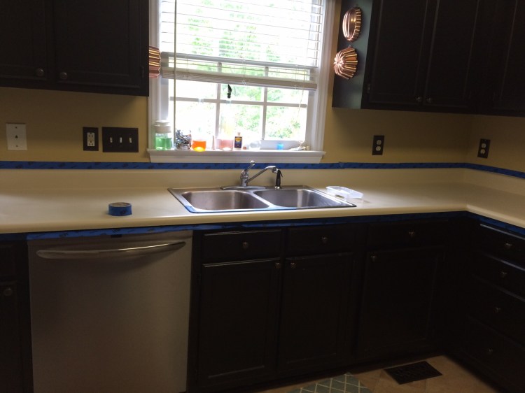 The first thing you need to do before you prime or paint is tape off anything you don’t want painted with blue painters tape. As you can see in the picture above I taped around my sink, backsplash and window. This is essential, don’t skip this step!