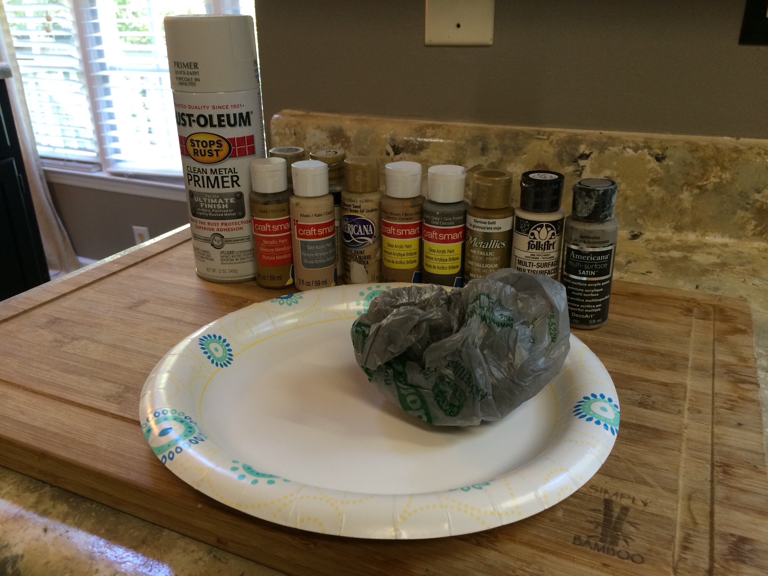 - Acrylic craft paint in a variety of colors. These are the cheap small bottles of paint that you can buy in any craft store and some discount retailers. I suggest getting a good mix of greys and beiges, along with black and either silver or gold.