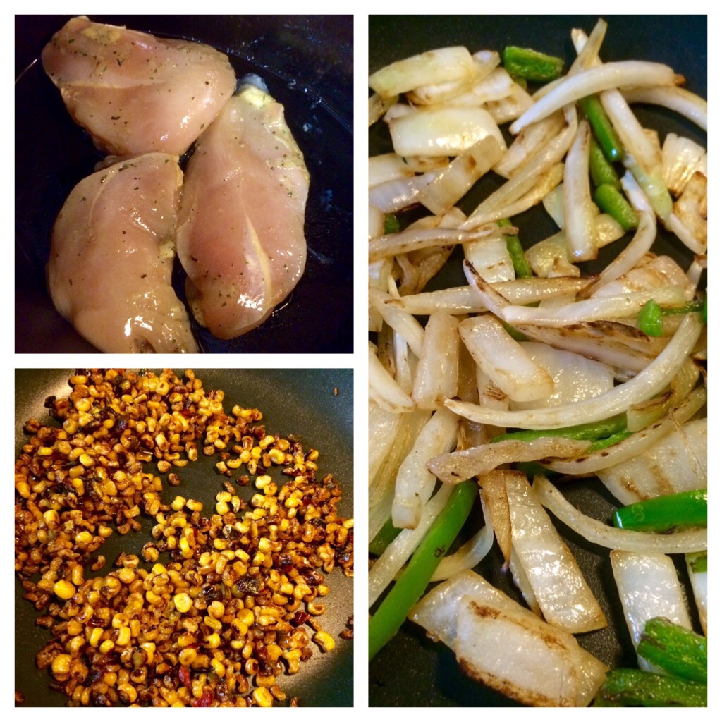 Next, using the same pan you roasted the corn in add your sliced onion and pepper. Cook them over medium heat until your onion starts to blister, then reduce heat and continue roasting for another 15 minutes or so.