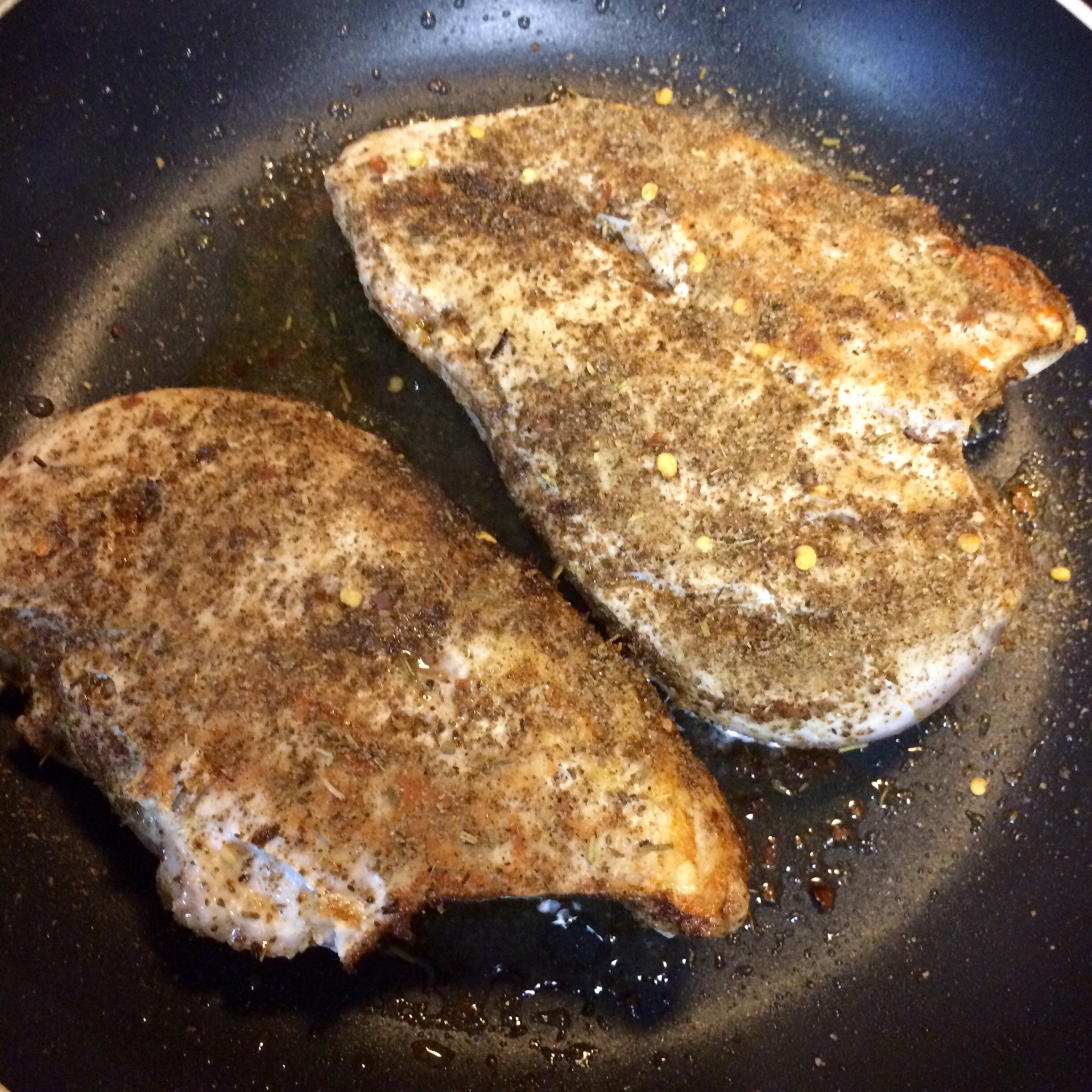 To get started melt your coconut oil over medium high heat and add the chicken breasts. Season the chicken with 1 tbsp of jerk seasoning, and flip after about 5 minutes. Cook the other side for another 5 minutes and when your done it should look like this:
