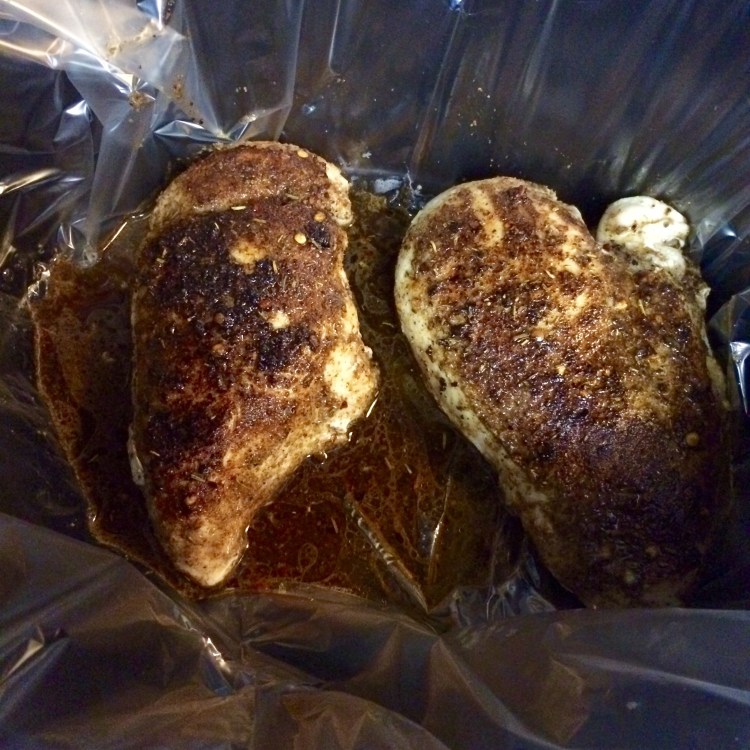 My chicken breasts were so big, I had to cut them in thirds halfway through cooking because I was afraid they weren’t going to soak up all the tasty juices. Use your judgement though… if you buy normal sized chicken you may not need to.