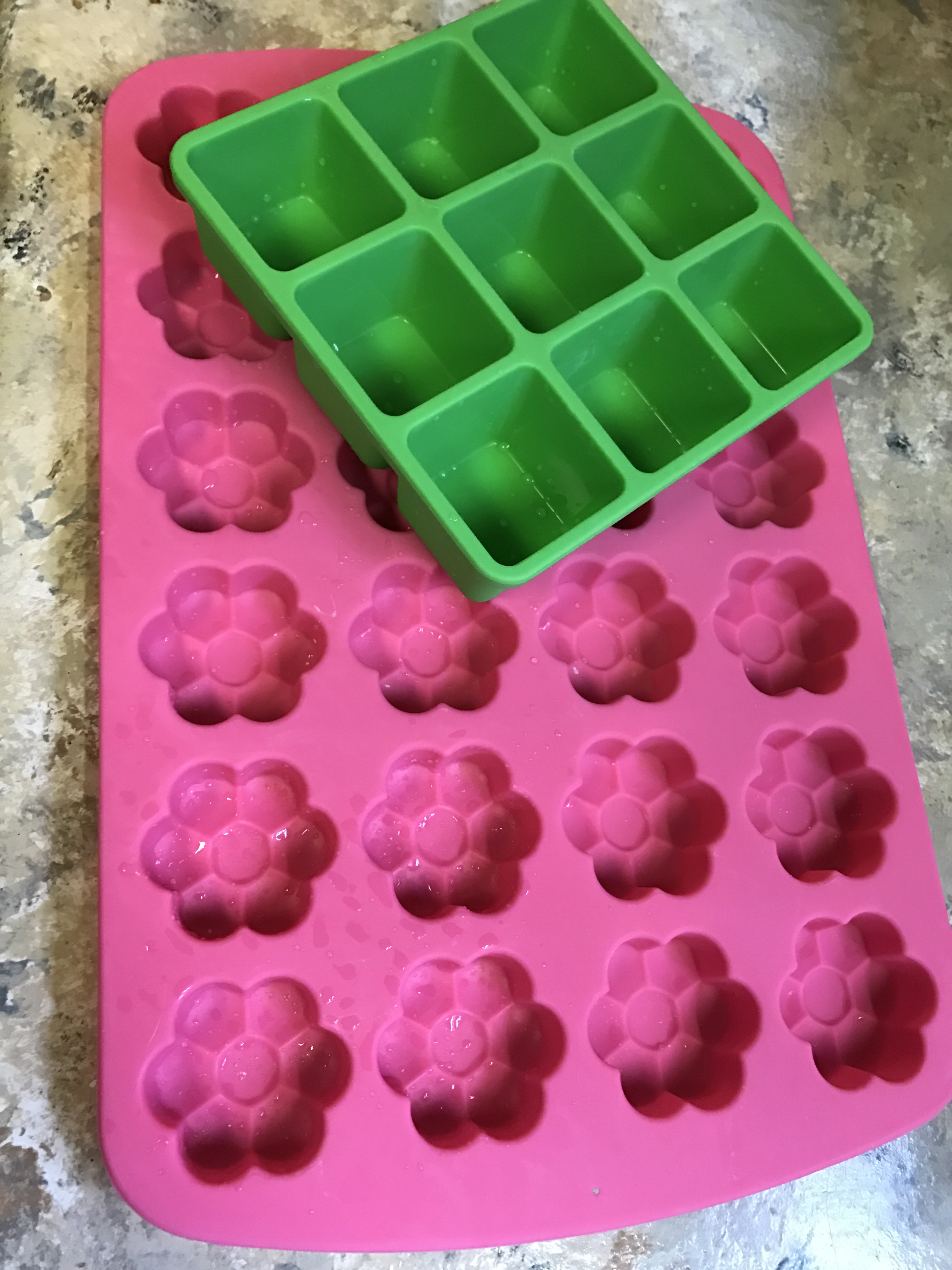 The green mold is actually made by Ball (the canning jar people) and is sold as an herb freezing kit, but I’ve never used it as that. The pink one is a chocolate mold that I picked up at the craft store. Using silicone molds is a great option because they are dishwasher safe and the soaps pop out very easily.