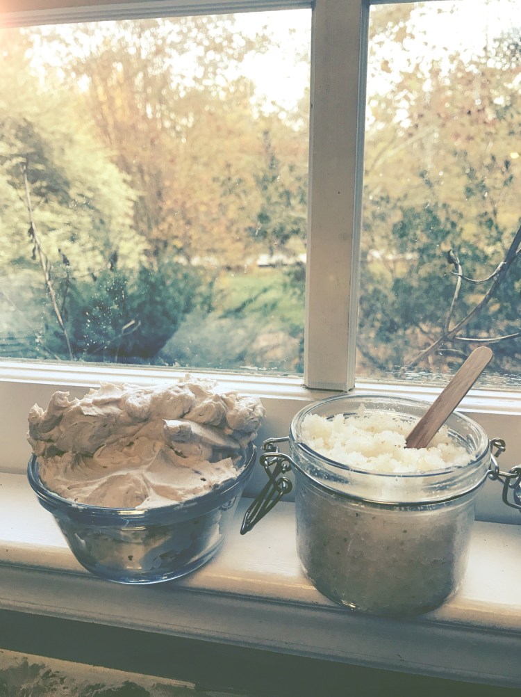 What is body frosting you ask? It’s a whipped blend of oils and butters that melt into your dry, winter skin to create beautifully soft and hydrated hands, feet, and legs. Sometimes I even put it on my face! Now, I know you’re looking at that picture and thinking “it looks like a Wendy’s frosty and she puts that on her face?!” Yes. Yes I do. And if you had dry skin like I do you would understand. 😬