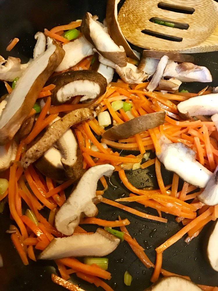 Cook the noodles until slightly chewy and then set aside. In a large, deep sided saucepan heat the hot pepper oil and add in the garlic, ginger, red pepper flakes, and green onion. Sauté for 2-3 minutes then add carrots and mushrooms and sauté for another 2-3 minutes.it should look like this: