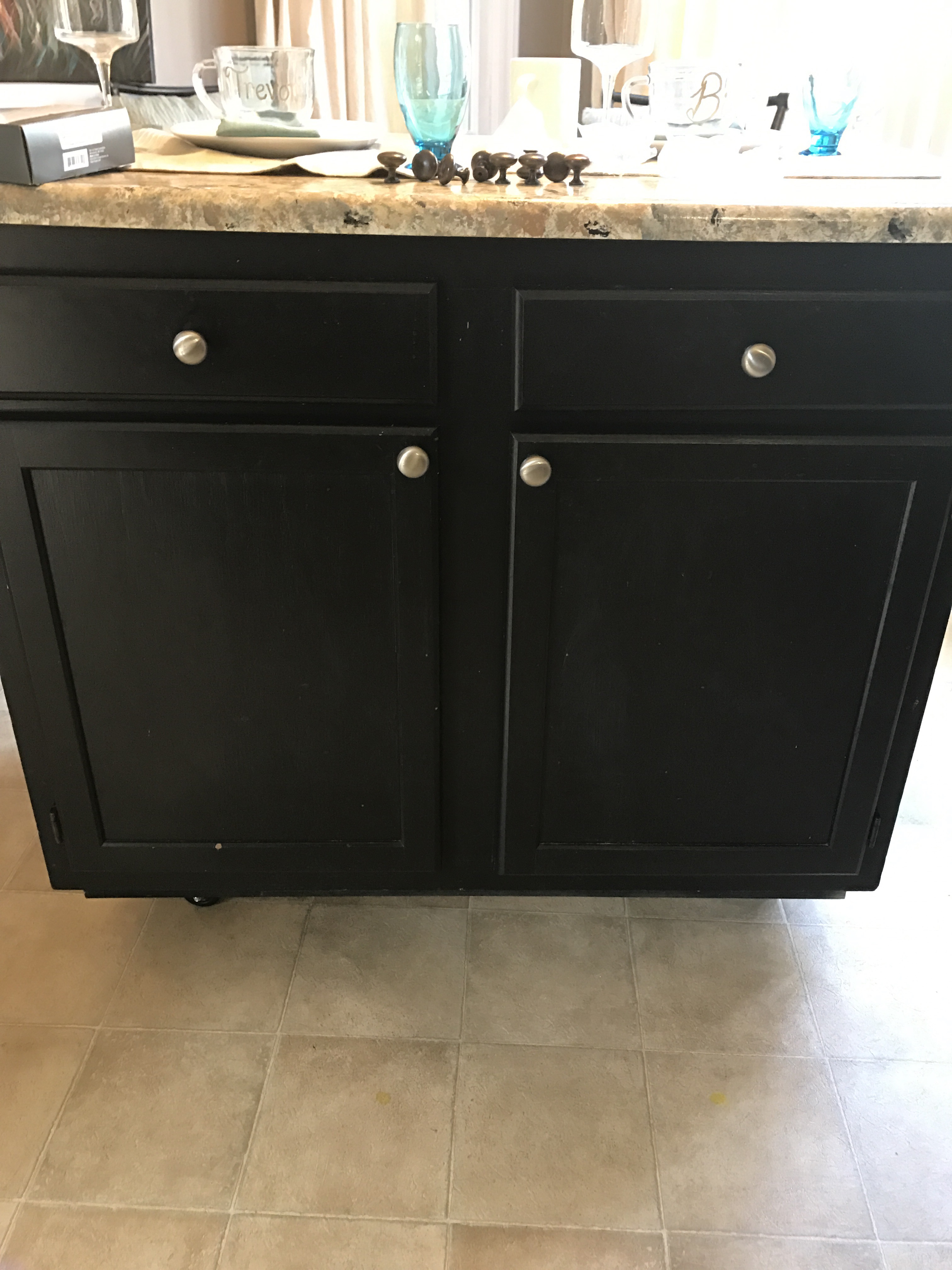 The thought of completely ripping off my countertops scares me a bit, so I thought I would start with my kitchen island, and see how that goes. My old countertops have been faux painted to look like stone, and they’re a serious improvement over the beige laminate that was the precursor to the faux stone, but I still am tired of them.