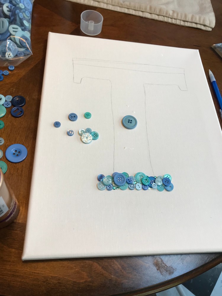 For my “T” I didn’t do a black outline, I just began by glueing my buttons to my pencil sketch. Aleene’s dries relatively fast, so I recommend working in small sections.